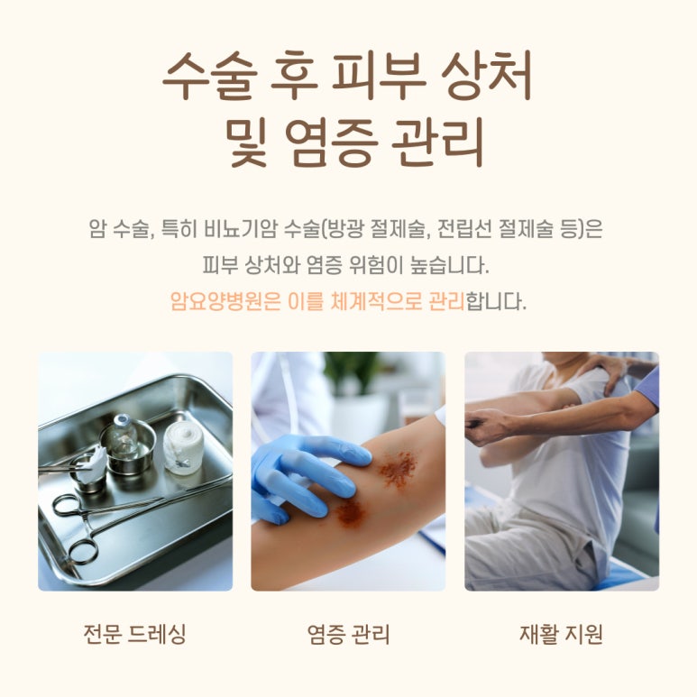 암 수술, 특히 비뇨기암 수술(방광 절제술, 전립선 절제술 등)은 피부 상처와 염증 위험이 높습니다.