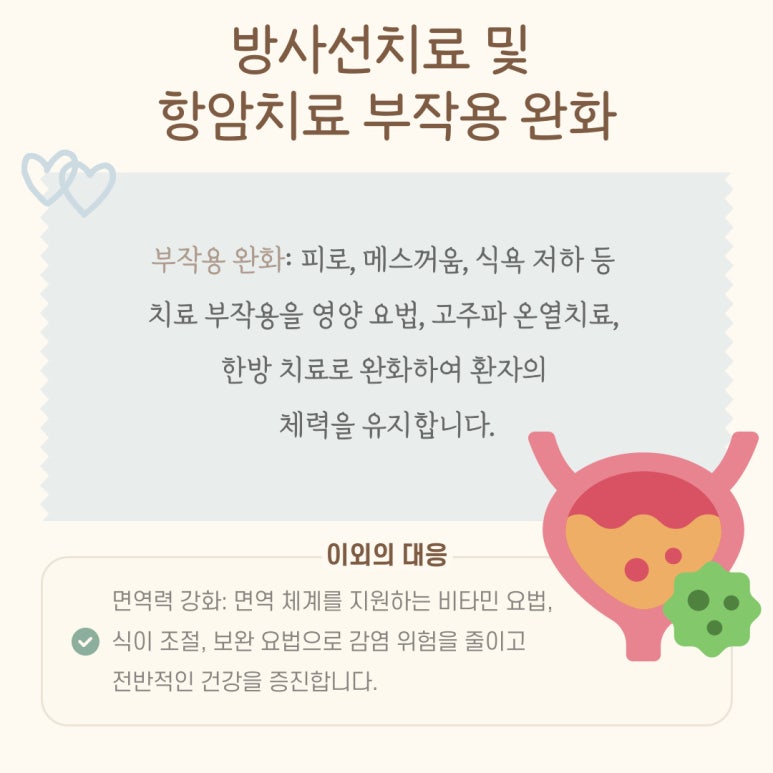 부작용 완화: 피로, 메스꺼움, 식욕 저하 등 치료 부작용을 영양 요법, 고주파 온열치료, 한방 치료로 완화하여 환자의 체력을 유지합니다.