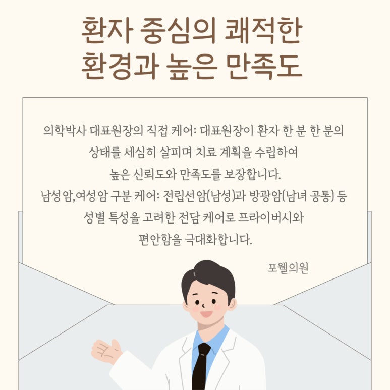 남성암·여성암 구분 케어: 전립선암(남성)과 방광암(남녀 공통) 등 성별 특성을 고려한 전담 케어로 프라이버시와 편안함을 극대화합니다.