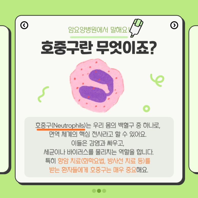 특히 항암 치료(화학요법, 방사선 치료 등)를 받는 환자들에게 호중구는 매우 중요해요.